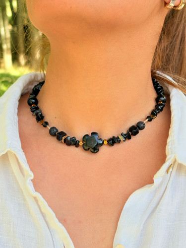 نیم ست گردنبند و گوشواره سنگ اونیکس تراش شکوفه وعقیق سلیمانی وابسیدین وسنگ لاوا