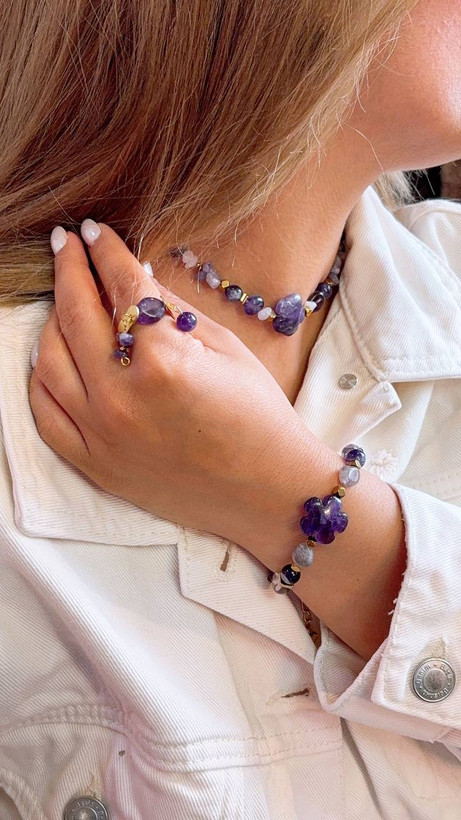 ست کامل |گردبند| دستبند |گوشواره | انگشتر | سنگ امیتیست | بین کاری سنگ حدید روش آب طلا | یراق استیل رنگ ثابت