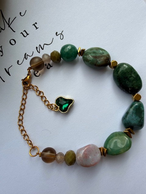دستبند سنگ تامبلی عقیق خزهای اصل با ترکیب جذاب حدید آبکاری طلا، ظاهری طبیعی و درخشان ایجاد میکند. با یراق استیل رنگثابت ساخته شده و در برابر استفاده روزمره مقاوم است. هماهنگی رنگها و بافتها این دستبند را به انتخابی خاص برای استایلهای اسپرت و کلاسیک تبدیل میکند.