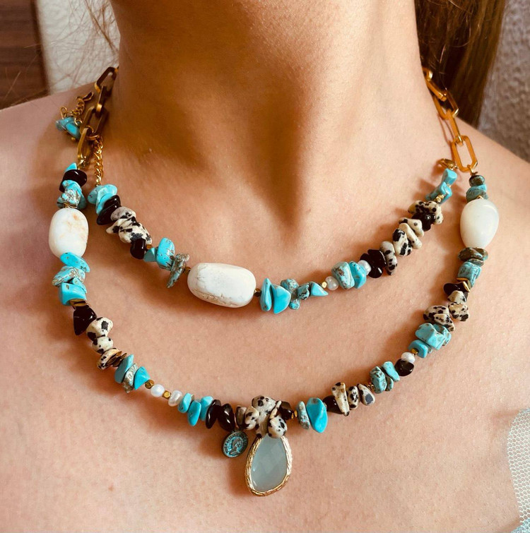 گردبند فیروزه و عقیق سفید | بین کاری سنگ حدید روکش طلا | یراق استیل رنگ ثابت