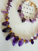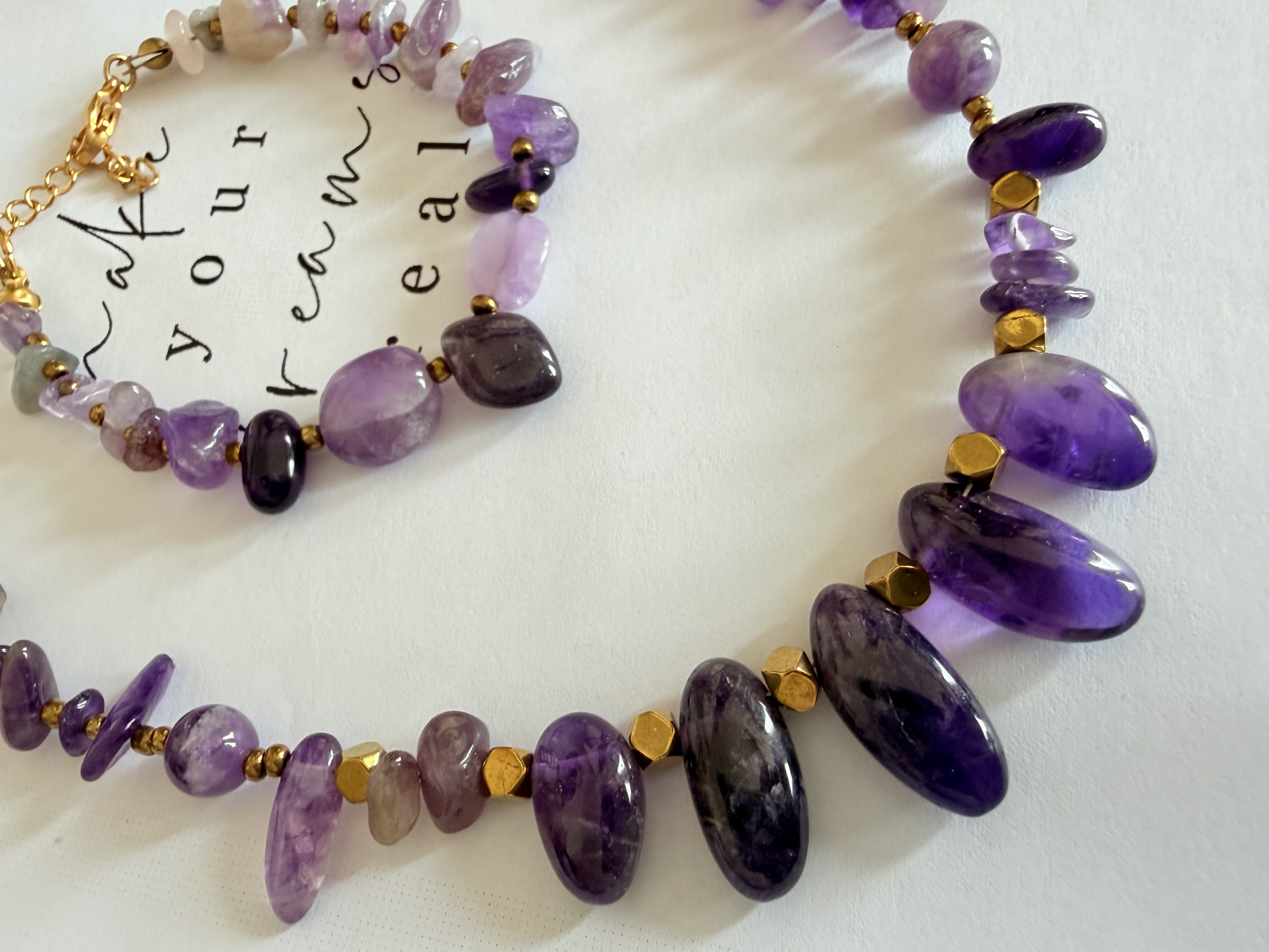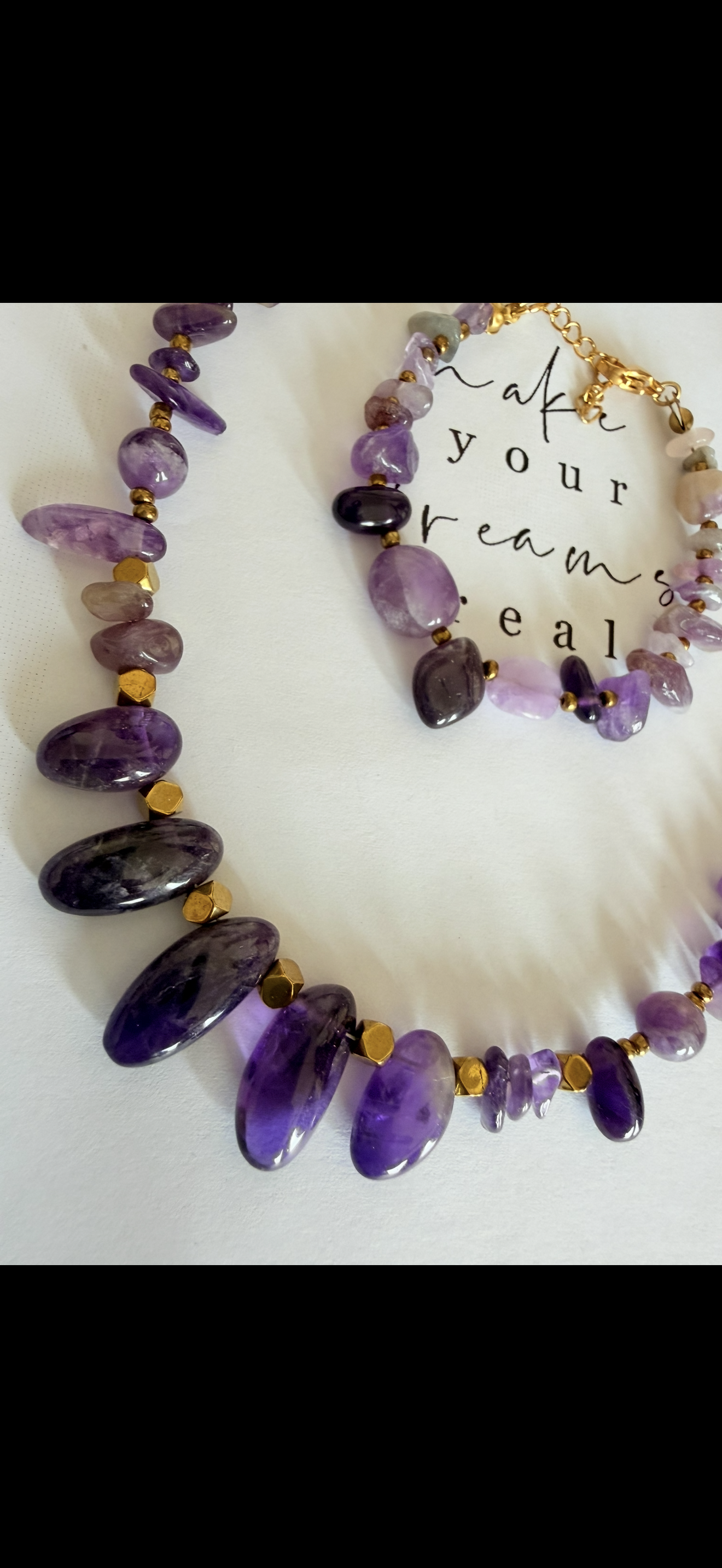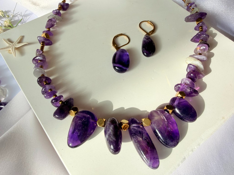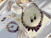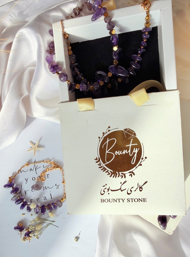 نیم ست 3تیکه آمیتسیت گردبند دستبند وگوشواره سنگ های دست تراش درجه یک گریدA ترکیب بااستیل درجه یک رنک ثابت ضدحساسیت