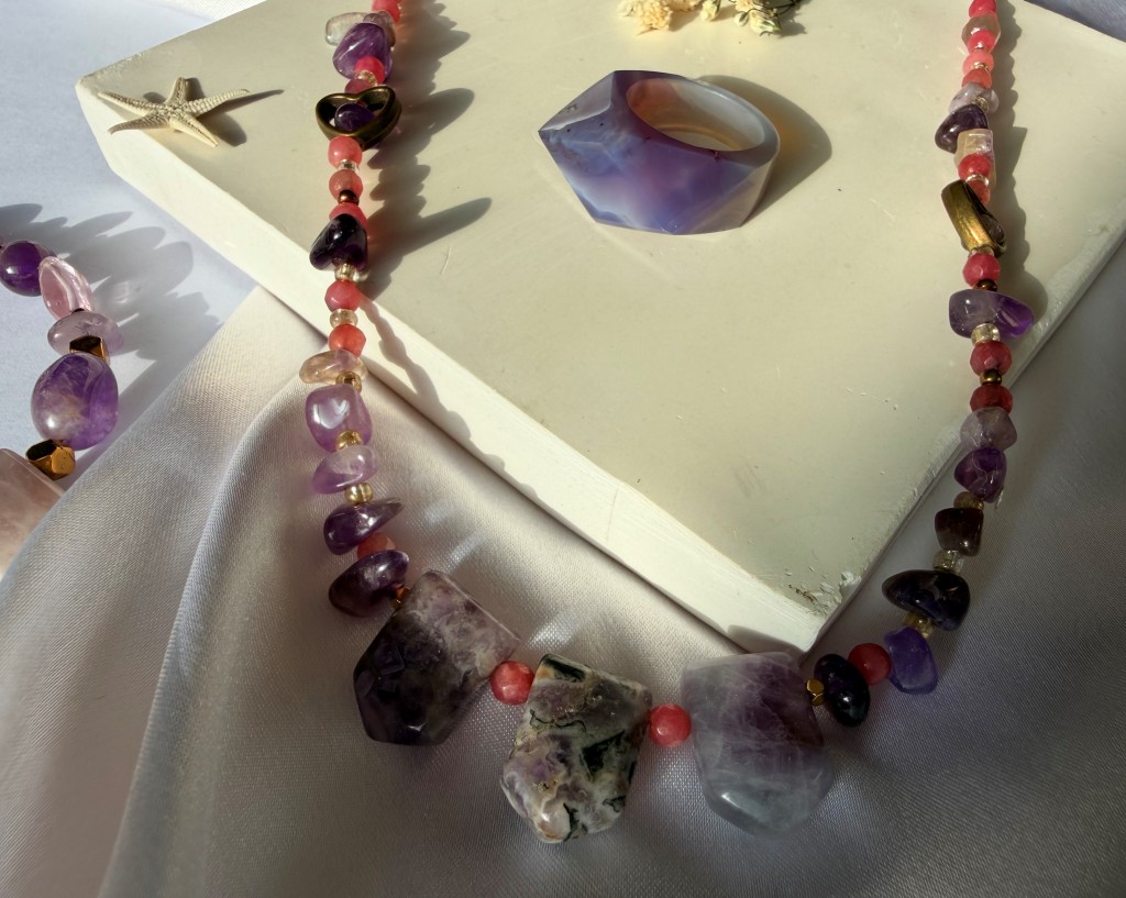 این نیم ست کاملا دست سازاست و چیدمان شده منحصر به فرد و تک نسخه میباشد ولی در صورت در خواست شما مجدد تراش وساخت میشود وحتی الامکان سعی میشود شباهت نزدیکی به محصول دست سازه قبل داشته باشدواتصالات با استیل درجه یک ورنگ ثابت وضدحساسیت ساخته شده ولی طبق سفارش مشتری مناسب با بودجه وسلیقه مشتری قابل تغییر بانقره925 یا طلا 18عیارهمراه بافاکتور رسمی ارائه میگردد.درضمن برای بین کاری های محصول از سنگ حدید که ابکاری طلا شدن استفاده شده که از انرژی بالایی برخوردار هستن.ارزشمند ورنگ ثابت میباشند.برای ساخت به جای نخ از سیم بوکسل استفاده شده گه فوق العاده قوی ومحکم هست.البته درصورت تمایل از نخ یاابریشم یا برنج وهمچنین طلا یانقره میت توان استفاده کرد.