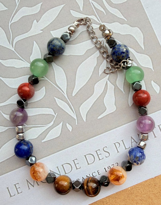 دستبند هفت چاکرا درجه یک باقفل وبست محکم واصول استیل رنگ ثابت ضدحساسیت رنگ نقره ای دارای زنجیر سایز قابل استفاده برای خانم ها واقایون