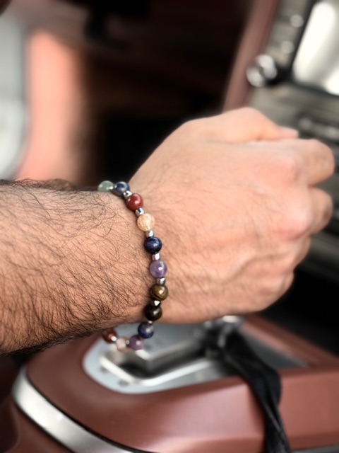 دستبند 7چاکرا یراق و زنحیر استیل بهترین کیفیت مردانه وزنانه سنگ حدید نقره ای