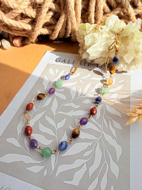 گردنبند هفت چاکرا درجه یک تراش جواهری. دارای زنجیر سایز رنگ ثابت که میتوان درهرهرسایی چوکر یا بلند ازان استفاده کرد