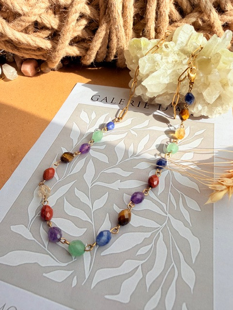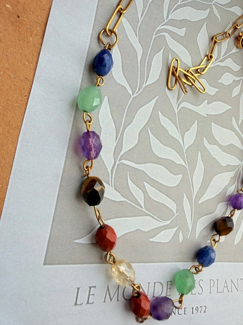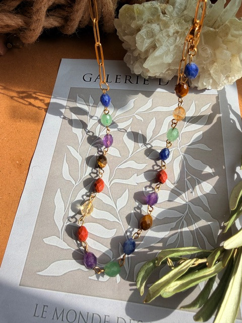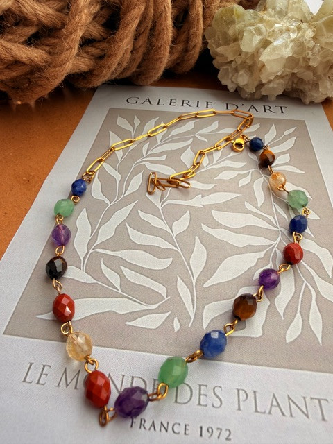 گردنبند هفت چاکرا درجه یک تراش جواهری. دارای زنجیر سایز رنگ ثابت که میتوان درهرهرسایی چوکر یا بلند ازان استفاده کرد