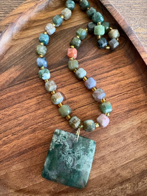 گردبند سنگ عقیق خزه ای سایز 8 تراش باکسی با سنگ حدید روکش آب طلا یراق استیل رنگ ثابت