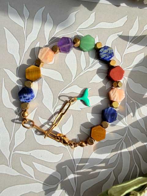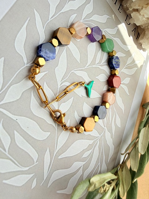 دستبند هفت چاکرا بااویز دم وال کیفیت بالا رنگ ثابت سنگ های هفت چاکرای درجه یک تراش شش ضلعی سنگ حدید ابکاری طلا وقفل وبست وحلقه وزنجیر سایز استیل درجه یک ضمانت دار