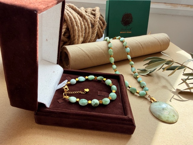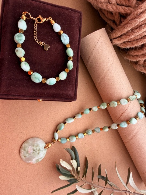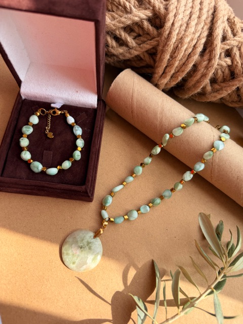 دستبند وگردنبند فوق العاده جذاب سنگ انجلیت واویز یشم کاهویی رنگ