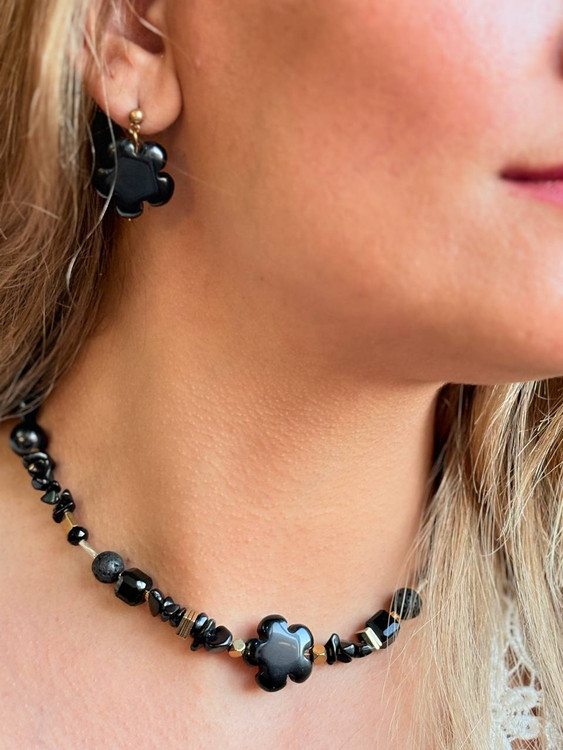 نیمست گردنبند، گوشواره و دستبند با سنگ عقیق سیاه و آبسیدن، علاوه بر زیبایی، انرژی محافظتی و آرامشبخش دارد. عقیق سیاه به جذب انرژی منفی و افزایش اعتمادبهنفس کمک میکند و آبسیدن موجب افزایش تمرکز و تعادل روحی میشود. طراحی شیک و دستساز این نیمست، جلوهای خاص به استایل روزمره و مجالس میبخشد و هدیهای منحصربهفرد است.