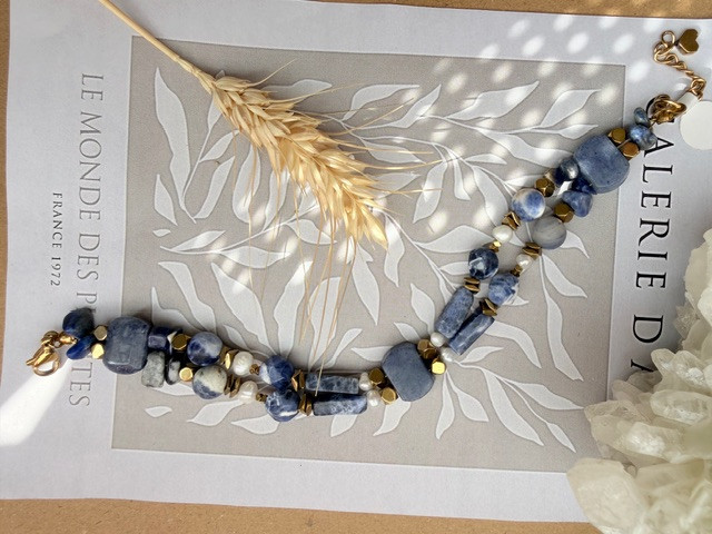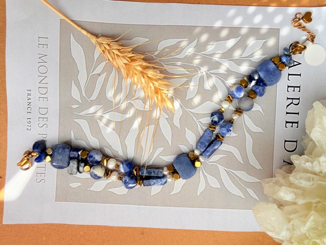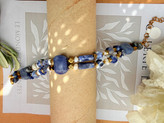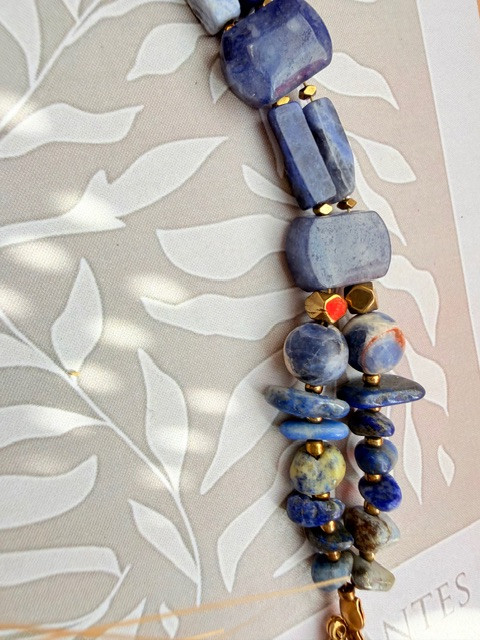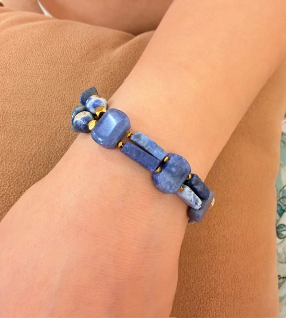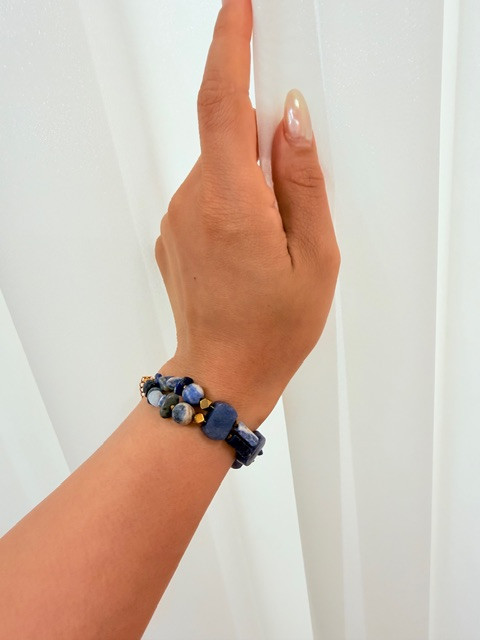 دستبند دوردیفه تراش جواهری درجه یک لاجورد وتراش مکعبی سودالیت بسیار زیبا وچشم نواز بین کاری سنگ حدید ابکاری طلا که رنگ ثابتن وانرژی بخشن