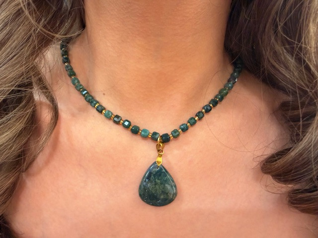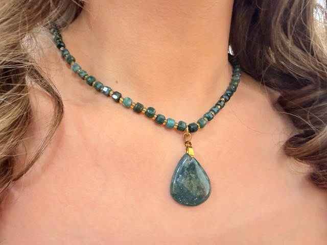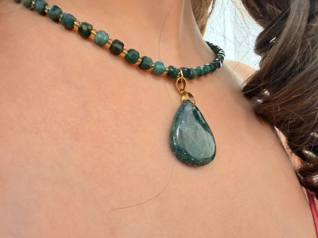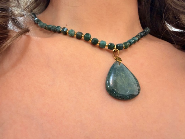 گردنبند تراش جواهری باکسی سنگ بکر یشم واویزه اشکی عقیق خزه ای